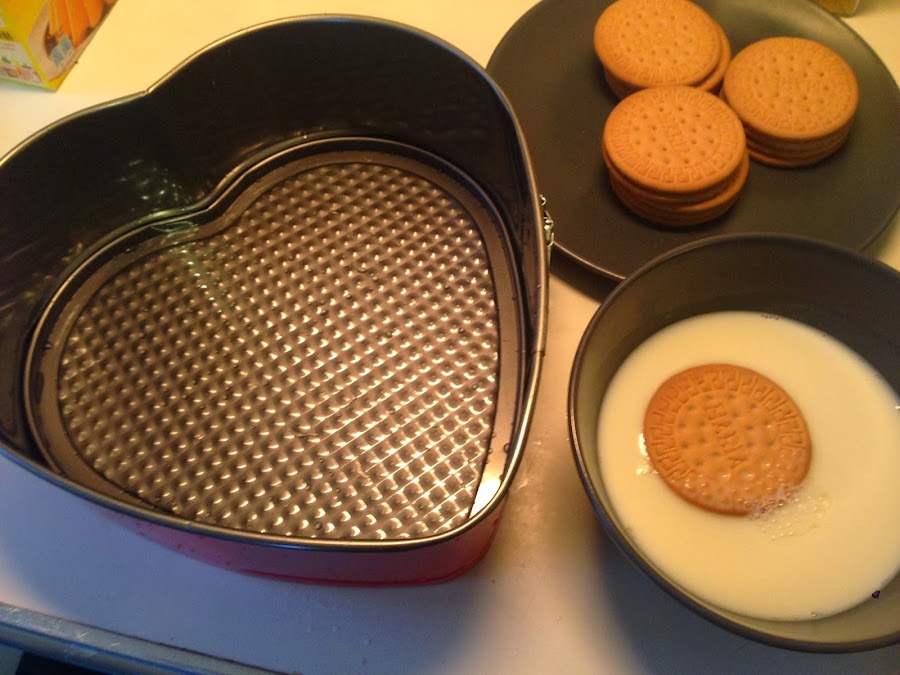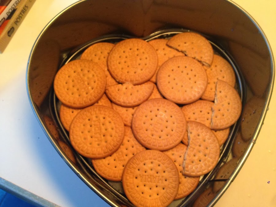 Lo primero es mojar las galletas en la leche, impregnarlas bien y colocarlas en la base, haciendo una cama.