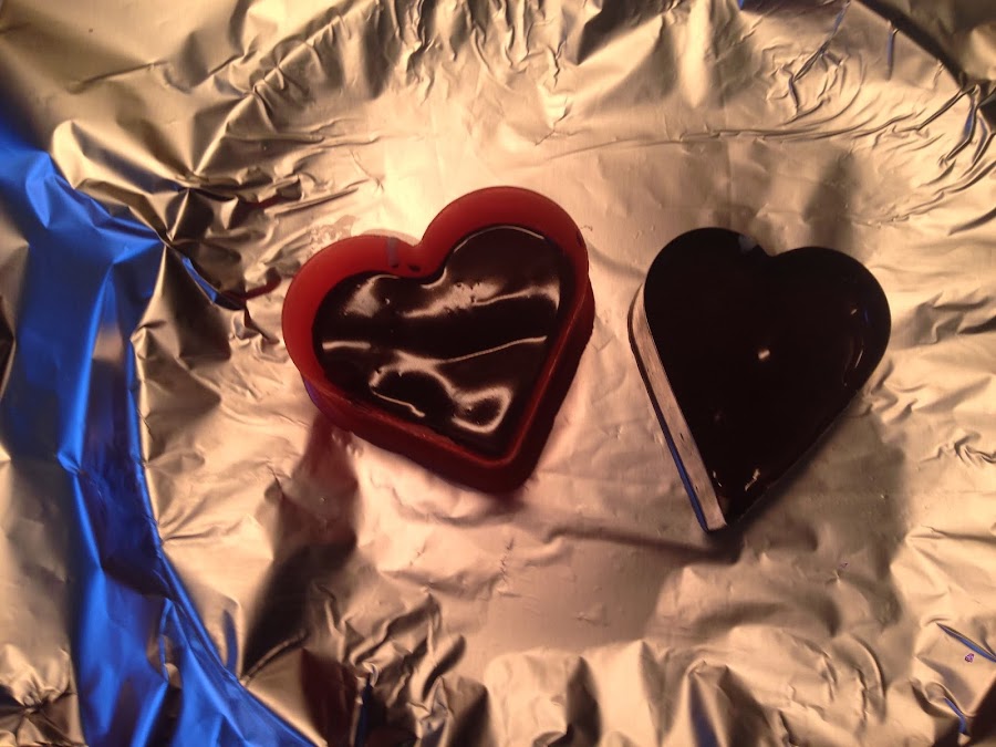Yo he utilizado unos moldes para galletas con forma de corazón y voy a hacer la parte de abajo de un color y la de arriba de otro, para eso colocamos papel albal encima de un plato y ponemos los moldes de galleta, vertemos por ejemplo el chocolate blanco primero y lo metemos en el congelador unos minutos, después vertemos el chocolate negro encima del blanco y lo mismo dejamos enfriar antes de des-moldar.