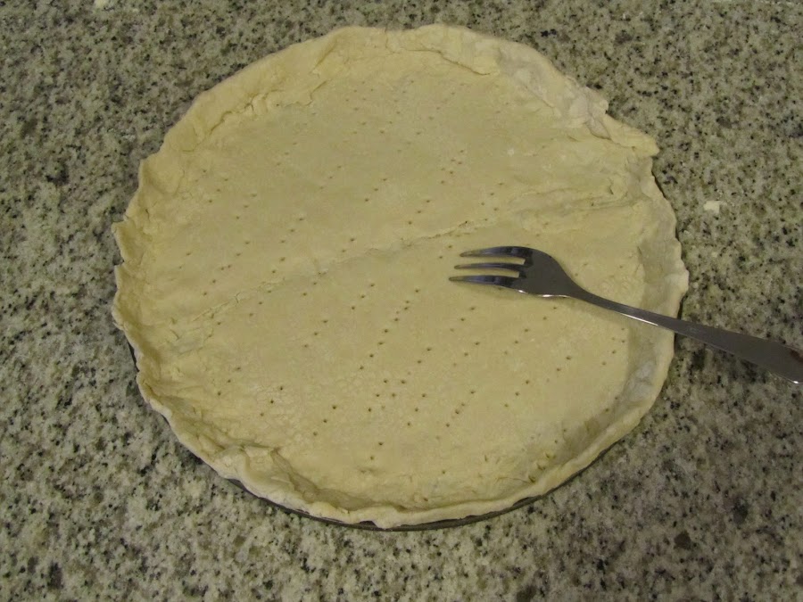 Extendemos la masa de hojaldre sobre una placa de horno (yo utilicé la parte de abajo de un molde desmoldable para que hiciera de base y quedara bien redonda) y pellizcamos los bordes. La pinchamos con un tenedor para que no suba mucho y la horneamos a 200ºC (precalentado) durante unos 10-15 minutos (tiene que quedar bien cocida pero sin que empiece a quemarse)