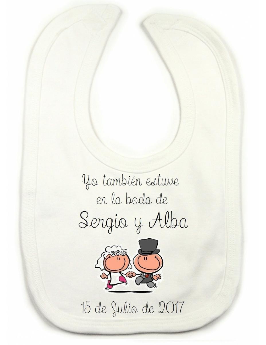 Otro detalle que sigue siendo tendencia y haciendo furor pese a llevar ya varios años en el mercado. Y es que ofrecemos un regalo único y personalizado exclusivamente para el cliente con sus datos de boda y nombres. Además ofrecemos un amplio elenco de modelos, y si ninguno te convence te lo creamos a tu gusto con tu imagen y textos deseados al mismo precio que el resto.Nuestros baberos son de gran tamaño y calidad, fabricados íntegramente en algodón y cierres sencillos. Nuestra filosofía de personalización también se plasma en nuestros bodies personalizados y de boda de tacto ultra suave y al mejor precio!