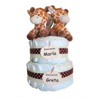 Otra espléndida creación en tonos unisex y de precio contenido para regalar a gemelos. Porque un regalo sea para gemelos o mellizos no tiene por qué estar reñido con un precio muy alto.Aquí nuestra estilosa tarta de pañales para gemelos con nuestra graciosa jirafa de peluche como protagonista. Los pañales son algo siempre útil y además se necesitan muchos a lo largo de la vida del bebé por lo que una tarta de pañales además de un regalo bonito y vistoso es un regalo muy práctico y un acierto seguro.