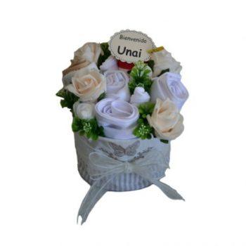 Aquí otra bonita combinación floral realizada de manera artesanal y de gran elegancia, para sorprender a papás y familiares con un regalo original y diferente. Nuestros bonitos ramos de ropita están hechos a mano de forma artesanal con mucho mimo y cuidado, especialmente diseñados para gemelos o mellizos. Los papás quedarán encantados!Disponible en rosa, azul o combinado azul-rosa, blanco. Otra de nuestras originales alternativas a las tartas de pañales y canastillas para bebés.