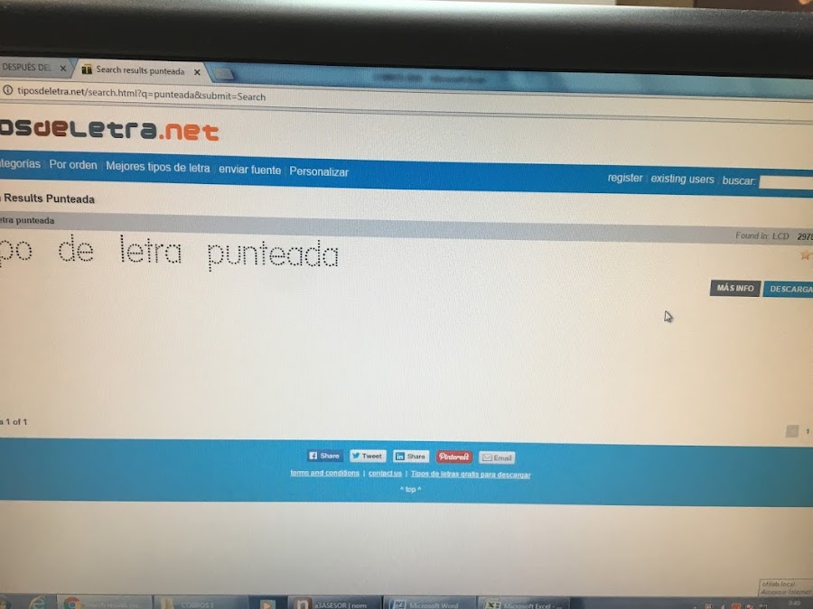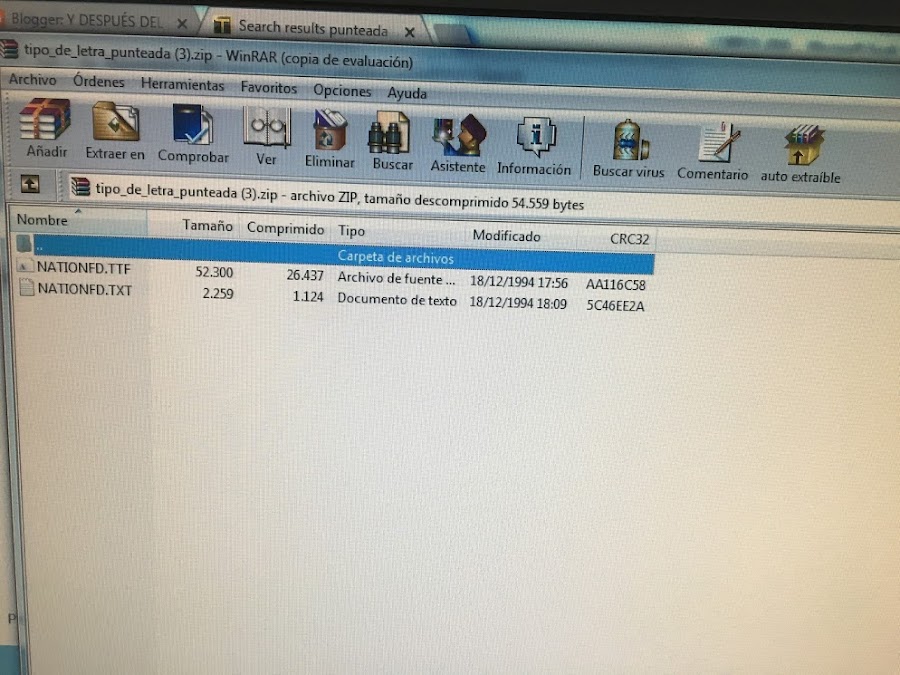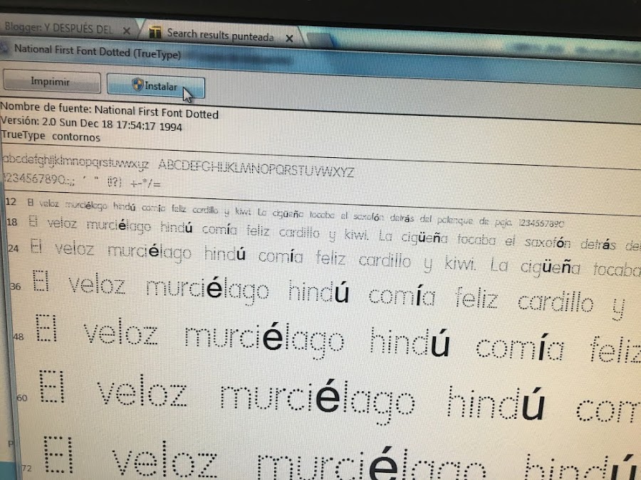 El tipo de letra es Escolar 4, la podéis descargar de donde queráis, yo lo hago desde aquí TIPOS DE LETRAS , una vez dentro buscáis TIPO DE LETRA PUNTEADA, le dais a descargar, se abrirá un archivo zip y luego le dais a NATIONFD.TTF, en la siguiente pantalla le dais a instalar y listo ya lo tendréis.