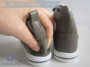 Como véis en la foto, conviene "pellizcar" los contrafuertes .... estos tienen que permanecer más o menos rígidos, si se doblan, con la misma facilidad que los de la foto no serán zapatos demasiado recomendables para los peques, pues no les sujetarán bien los piesecitos !!