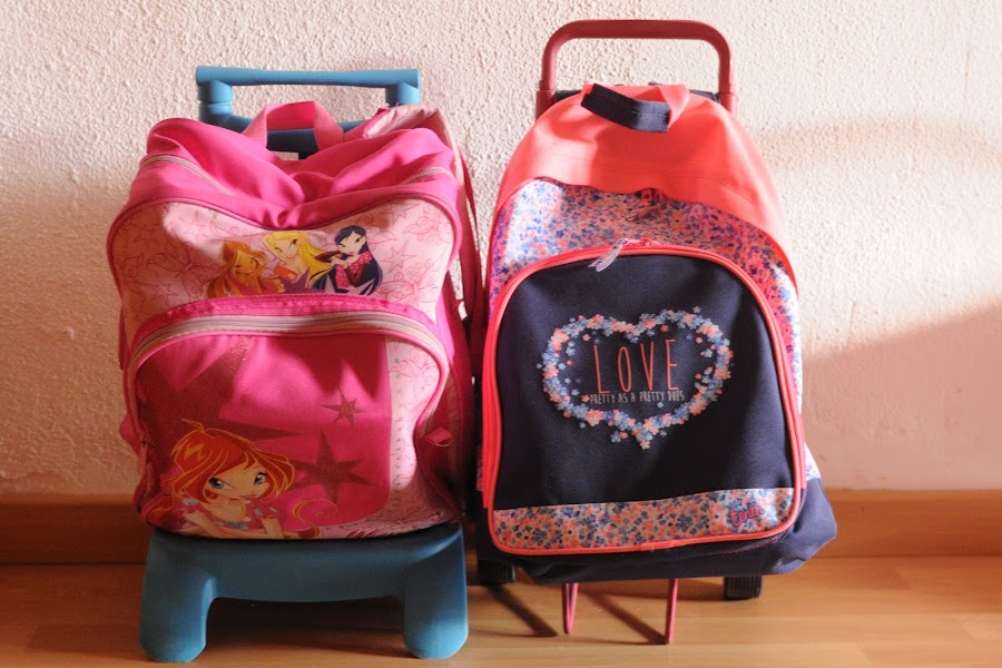 Empezamos por las dos mayores que van a cursar 3 y 4 de primaria.Cuando empezaron la etapa de primaria decidimos comprarlas mochilas con carro,ya que pensamos que era mejor que llevaran el peso sobre la espalda.