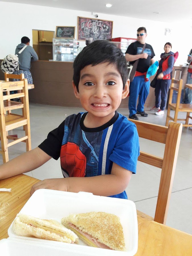 Luego la movilidad nos llevó a 20 min. del puerto a una cafetería con restaurante para que podamos comer algo e ir a los servicios. Nosotros apovechamos para tomar un café y Sebastian comió un mixto, algo ligero porque luego iríamos a almorzar.