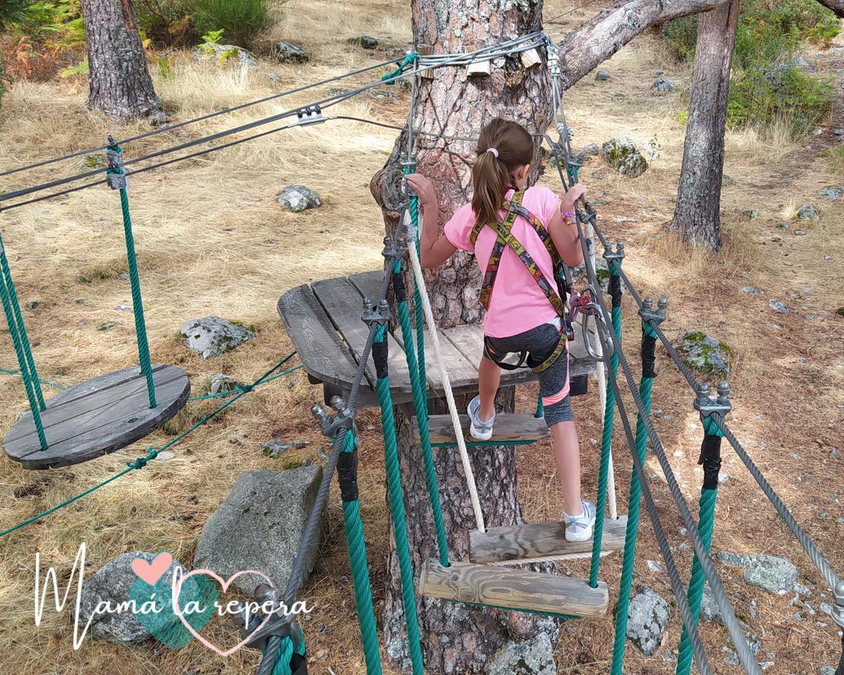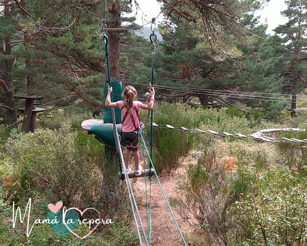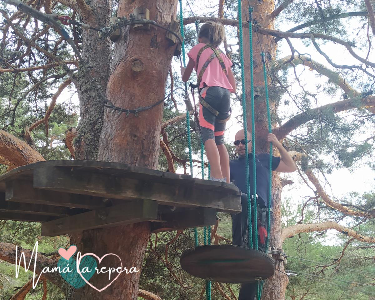 Al principio del recorrido hay un columpio y una tabla de surf para deslizarse de un árbol a otro. Quizás este fue el que menos le convenció a niñarepera porque no cogía tanta velocidad como en las tirolinas, que es lo que le gusta a ella.