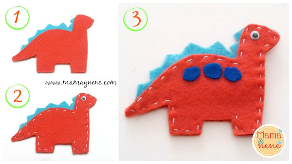 Elabora el molde del personaje que deseas y transfiérelo al fieltro por duplicado. El molde de nuestro títere de dinosaurio lo encontrarás más abajo. Pega ambas caras con silicona líquida dejando un tramo libre, por el que irá después el dedito o en todo caso el lápiz o rotulador.