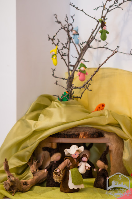 Para ir haciendo el proceso poco a poco, cada noche se puede reemplazar a un niño raíz por un niño flor, de manera que llenemos toda la mesa de flores, también flores silvestres por supuesto, o incluso de fieltro o madera (nosotros aprovechamos este momento y colocamos también algunas que tenemos del calendario anual y de la corona de cumpleaños de Sunflower).