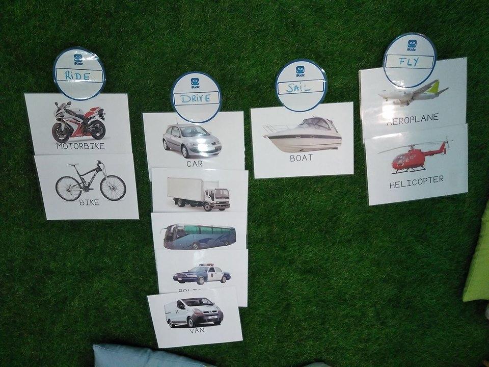 En esta foto podéis ver como los utilizábamos para conectar los transportes con sus verbos, pero para un taller de Halloween podéis utilizarlos para unir aquellos elementos de Halloween que dan miedo (skeleton, spider…), y los que les gustan (Candy, etc.).