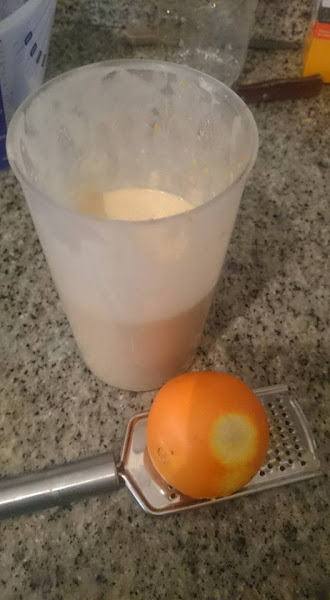 Ponemos en el vaso de la batidora los huevos, los 30 gr aproximados de mantequilla, el azúcar, un pellizco de sal y la leche y batimos todo. Después incorporamos la harina junto con la levadura y batimos todo de nuevo. Quería darle un toque diferente así que rayé un poco de naranja. Después dejé reposar unos 20 o 25 minutos la mezcla.