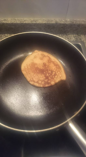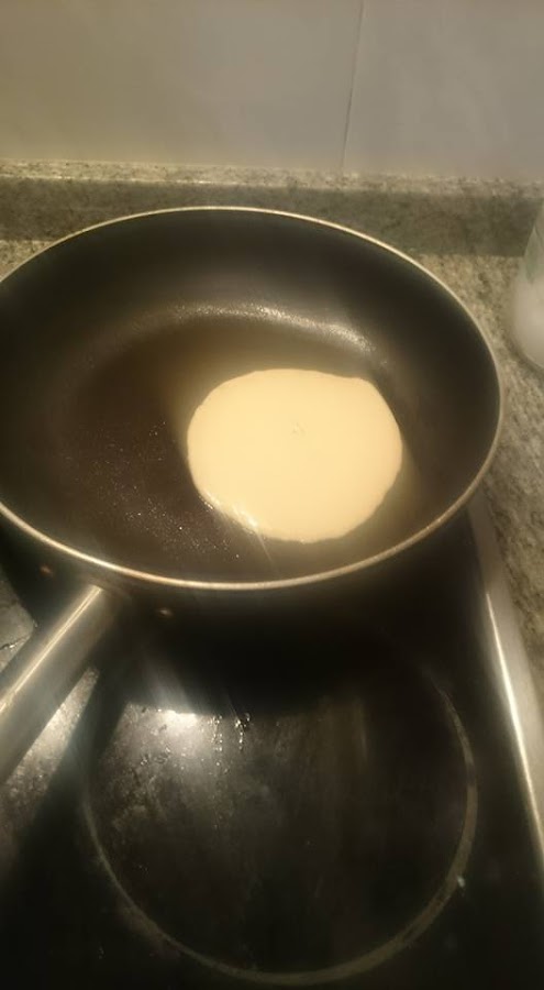 En la sartén (antiadherente, preferiblemente) restregué un trocito de mantequilla mientras se calentaba a fuego fuerte, esto solo lo hice al principio con la primera tortita, no hay que repetirlo después.