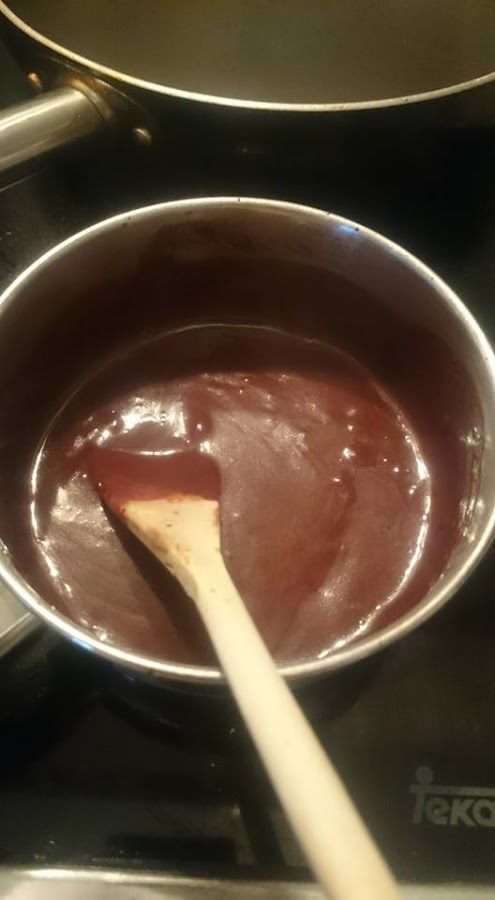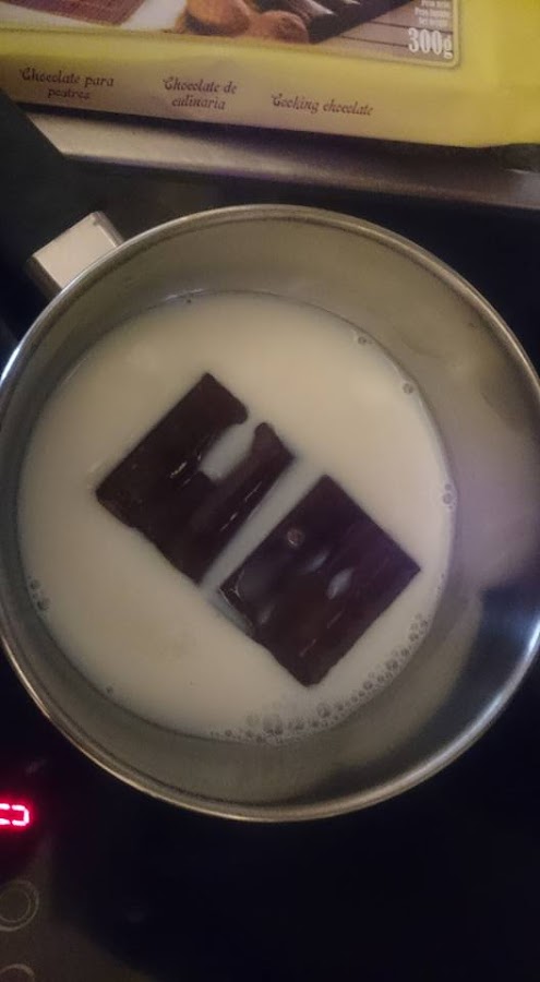 El chocolate lo hice yo, cogí chocolate especial repostería, fui poco a poco echando trozos y echando leche, y un poco a ojo hasta conseguir la textura deseada. Cogí este tipo de chocolate porque como buena amante del chocolate este tipo tiene un sabor más intenso.