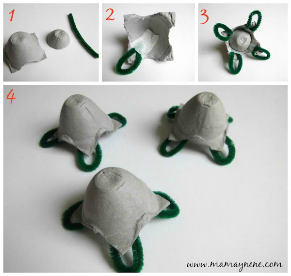 Cortamos dos portahuevos por cada tortuga como en la foto: uno entero y otro solo la mitad, y cuatro trocitos de 10 cm. de limpiapipas.