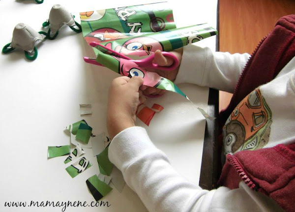 Que el peque recorte a su gusto trocitos de papel de diversos colores o papel de regalo, luego aplicará goma con ayuda de un pincel y decorará cada tortuguita.
