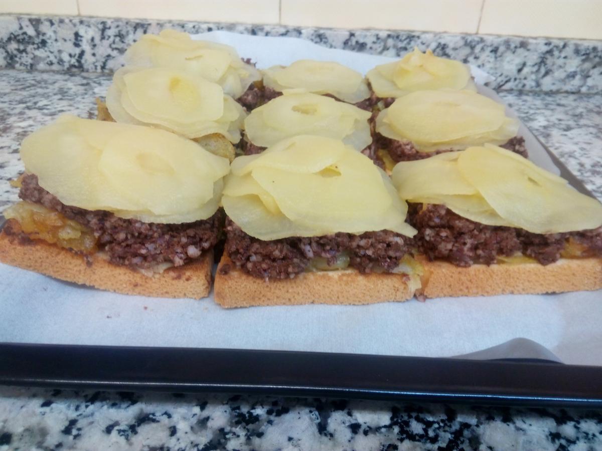 Sobre el pan de molde poner una capa de manzana, otra de morcilla y por último la patata.