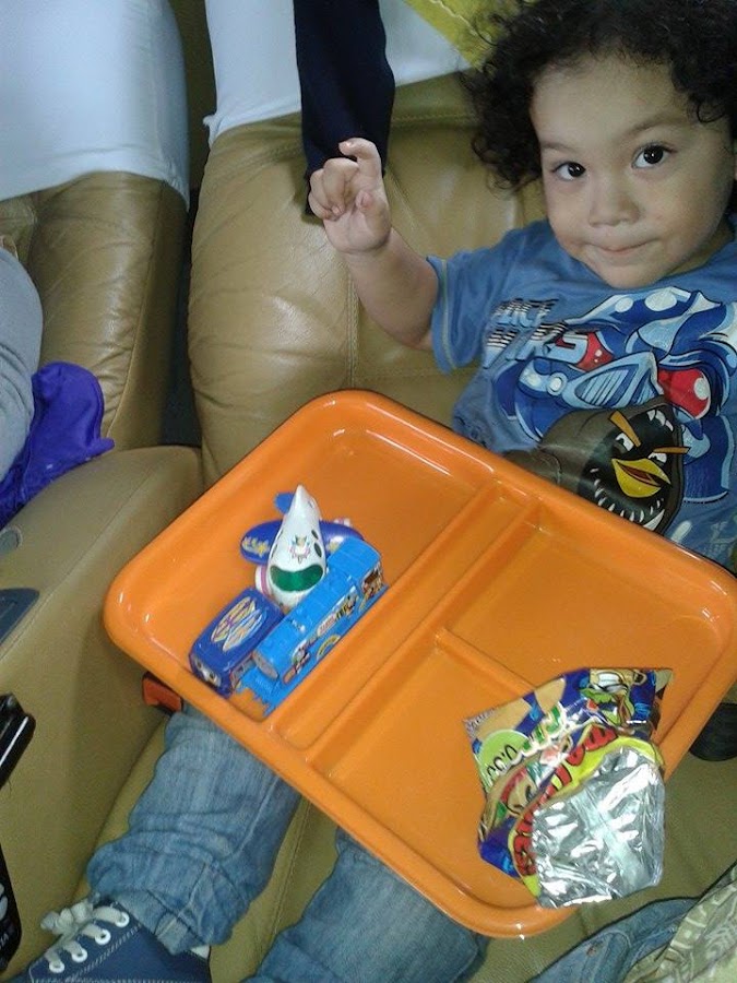 Luché para que se sentara en el asiento pero lo conseguí, sacamos su mochila que estaba llena de juguetes (carros, pelotas, libros para colorear, colores), lleve algunas golosinas de provisiones...