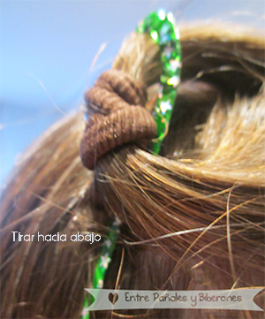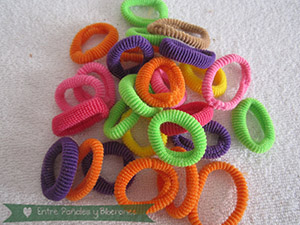 Ahora, el truco que yo uso, partiendo de unas gomas de pelo normales y corrientes, eso si, de tamaño pequeño, en función de la cantidad de pelo de nuestra peque, : )