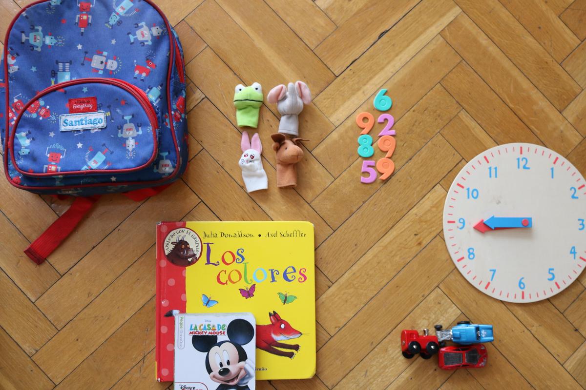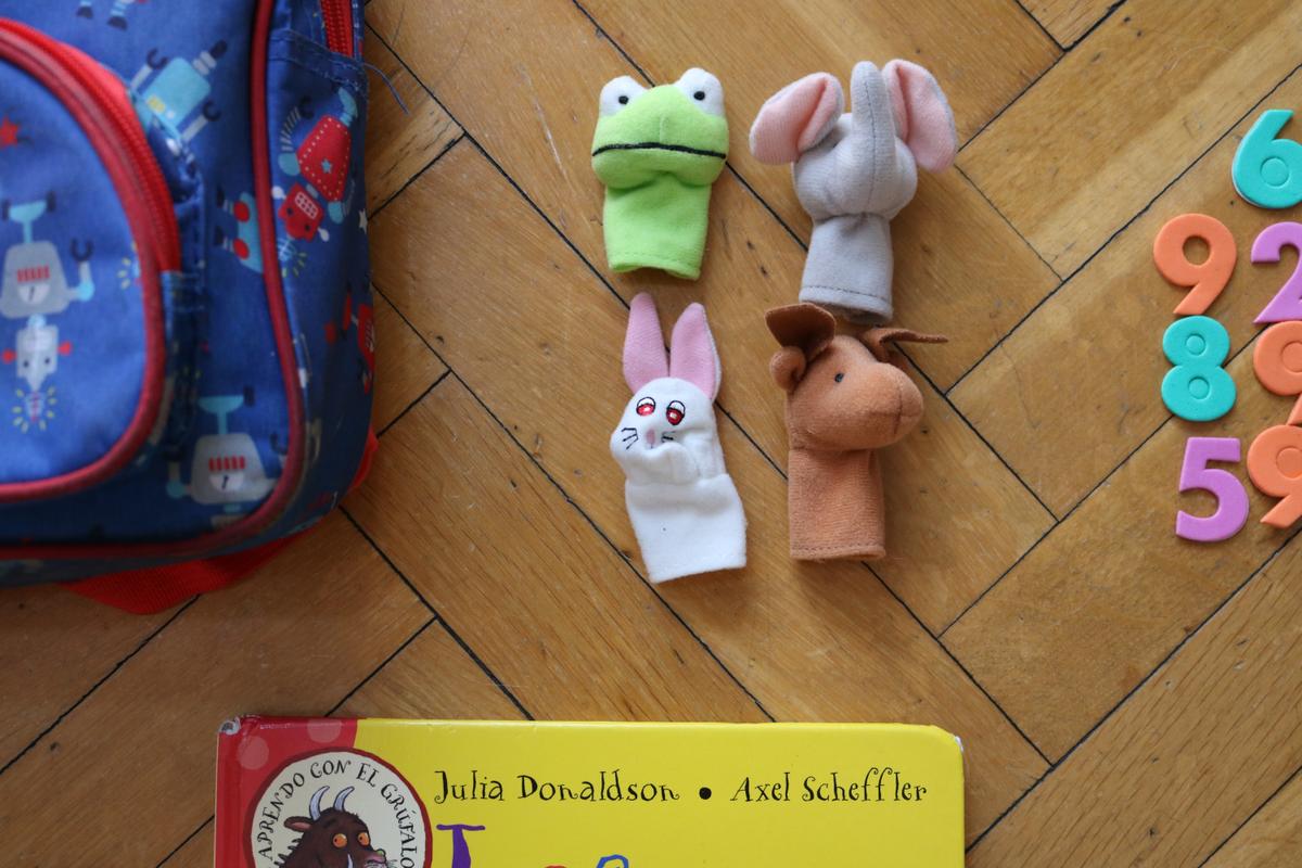 Como la idea es ocupar el mínimo espacio, el objetivo es que estas bolsitas nos quepan en un bolso pequeño; bolsitas con títeres de dedos, cuentos simples, tarjetas con formas y letras, pegatinas, botellas sensoriales, animales de plástico o un par de coches. La idea es ir dándole las cositas por grupos de tal manera que cuando se aburra de alguna actividad pasamos a la siguiente. Yo suelo llamarlas como “la media hora ganada” porque ese el tiempo aproximado que le puede parecer entretenido cada juego.