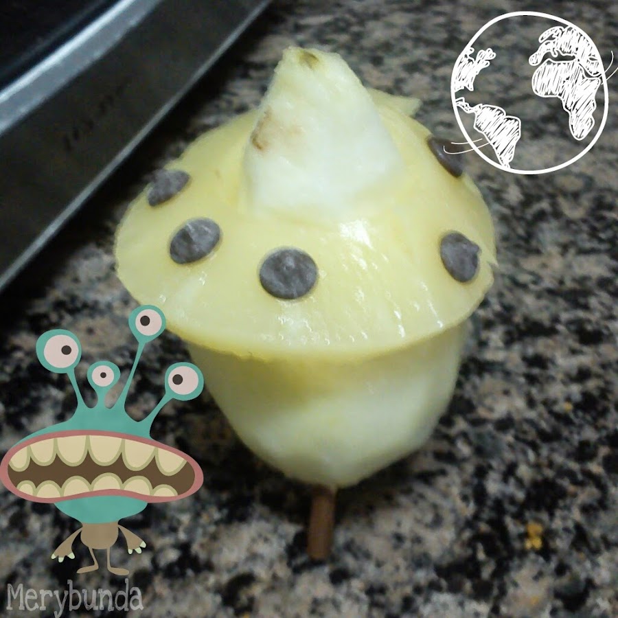 Con los platanos también hacemos dibujitos en la cáscara, ellos dibujan en un papelito lo que quieran que se vea en su platano y los papás lo repasamos a puntitos con un alfiler sobre la cáscara. Éste es el resultado final:
