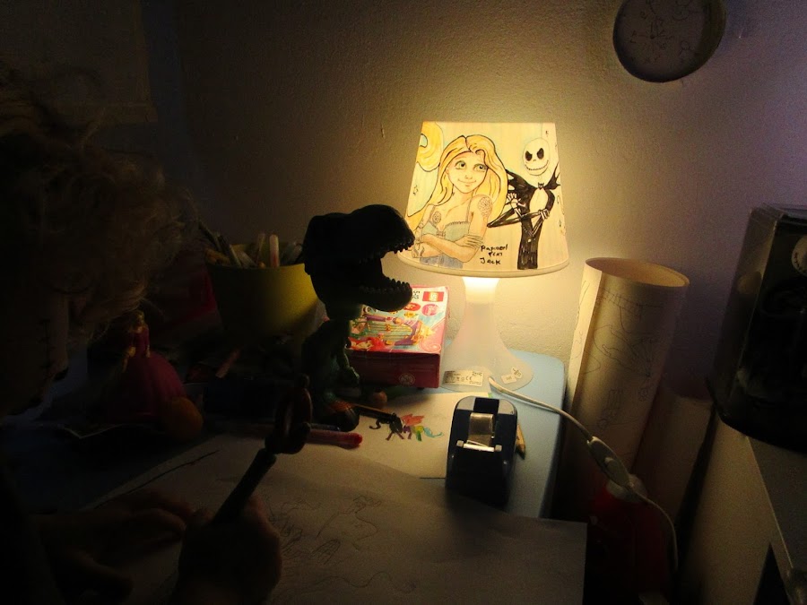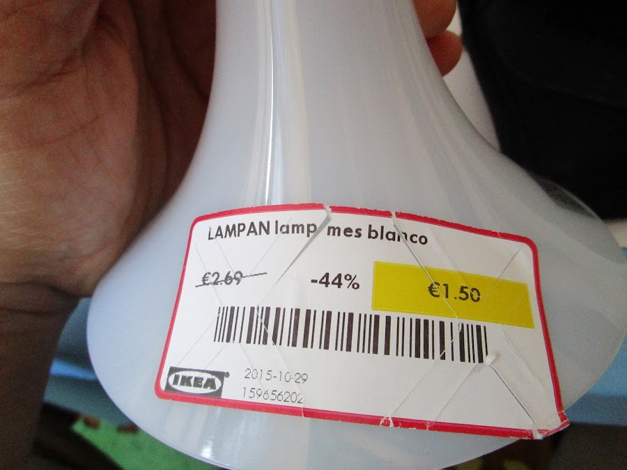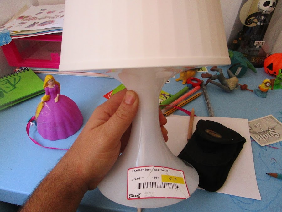 Darse una vuelta de vez en cuando por la sección de oportunidades de Ikea sirve para crear pequeños proyectos sencillos como este. Se trata de una lampara de mesa de Ikea modelo Lampan, muy barato, pero además comprado en la sección de oportunidades por un precio de risa (1,5€). A esto creo que lo llaman "ikeahacking". Solo se necesita un lápiz, unos rotuladores negros para CD, los rotuladores de colores del niño y una idea. La idea tiene inspiración de Halloween y es un poco friki.