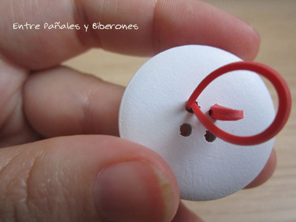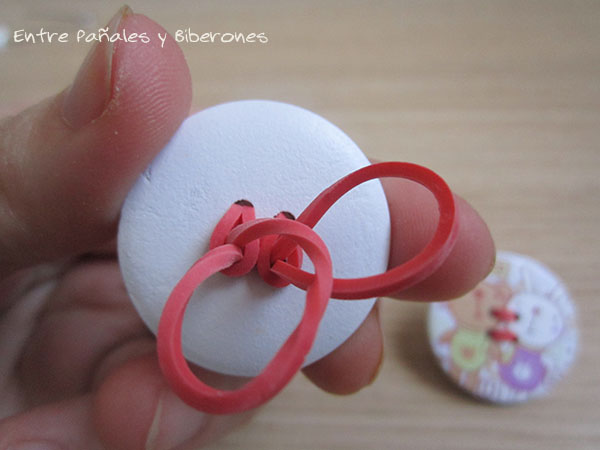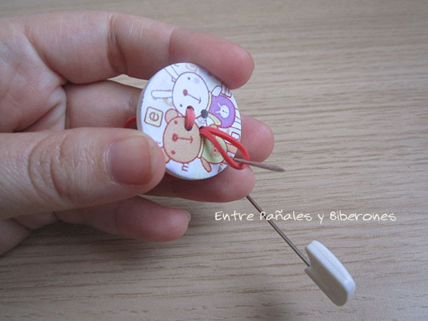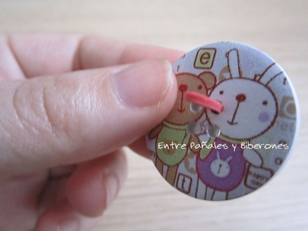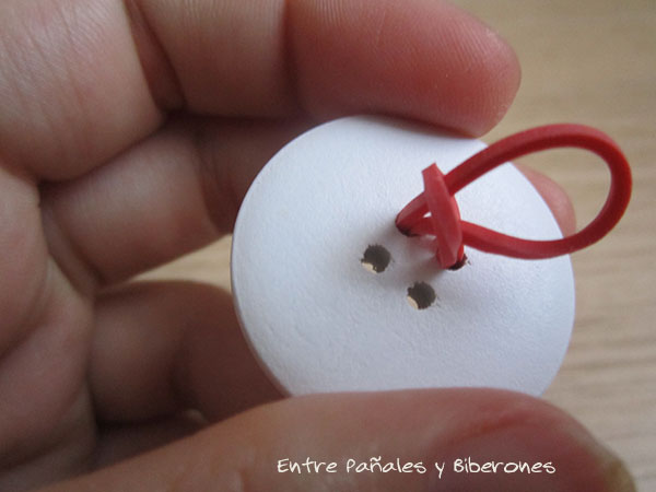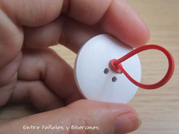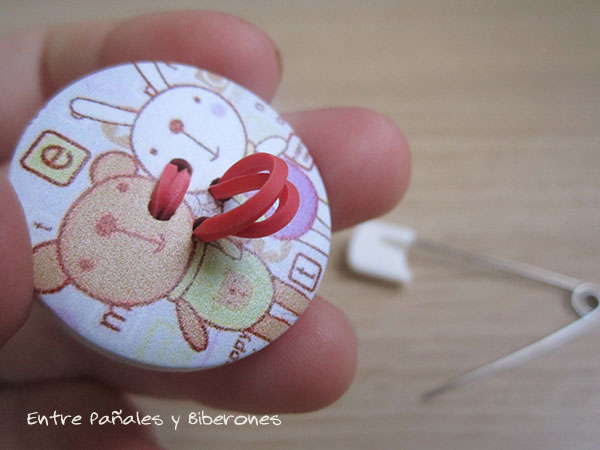 Podemos ayudarnos de una aguja o un imperdible (en mi caso) para pasar la goma elástica más fácilmente a través del botón.