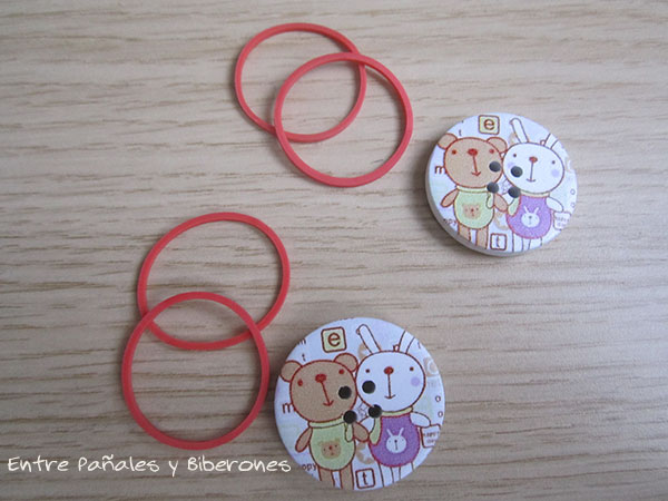 No tenemos más que pasar las gomas elásticas por los agujeros de los botones elegidos ( yo he usado dos por botón, por seguridad más que nada, para que en caso de que se rompa una de ellas la pieza quede sujeta y no se extravíe )