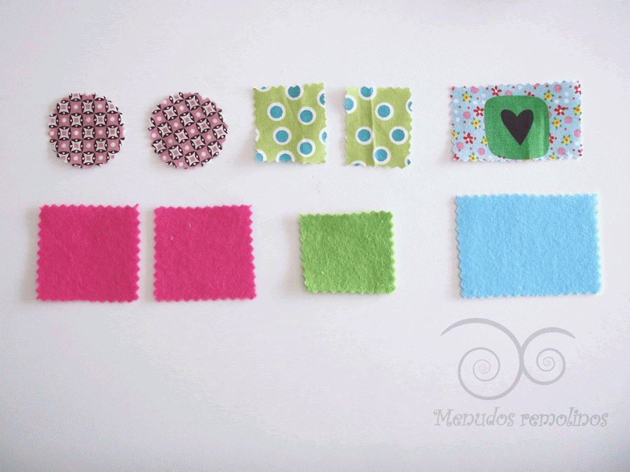 Cortamos la tela que queremos usar. Yo he cortado formas básicas: círculos, cuadrados, rectángulos, ... pero podéis usar vuestra imaginación para hacer otro tipo de siluetas