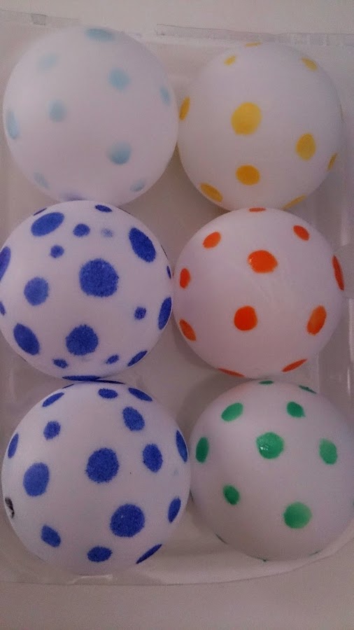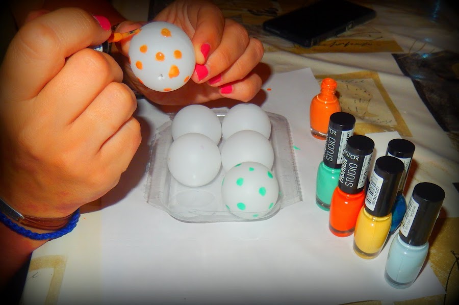 Le hacemos un agujerito a las pelotas de pinpon y pintamos como más nos guste, yo le he hecho lunares. Utilicé algún permanente y lacas de uñas.