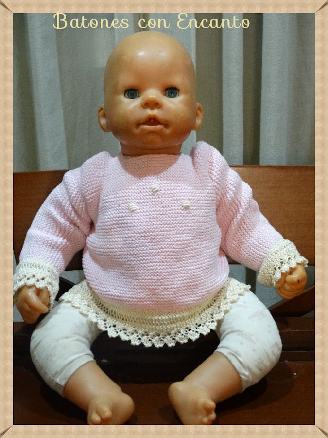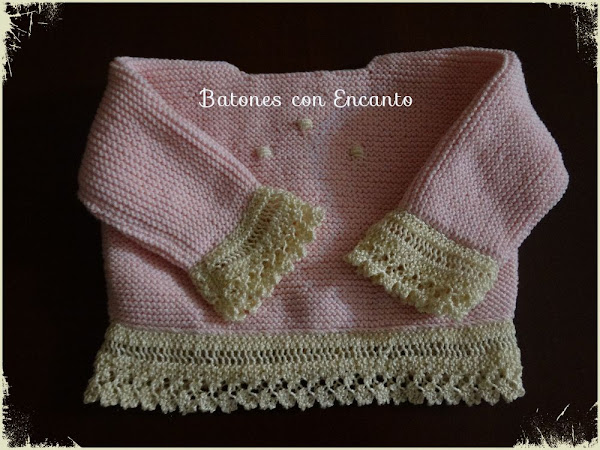 Hoy he terminado un nuevo jersey de primera postura en color rosa, con una puntilla preciosa en color beige.