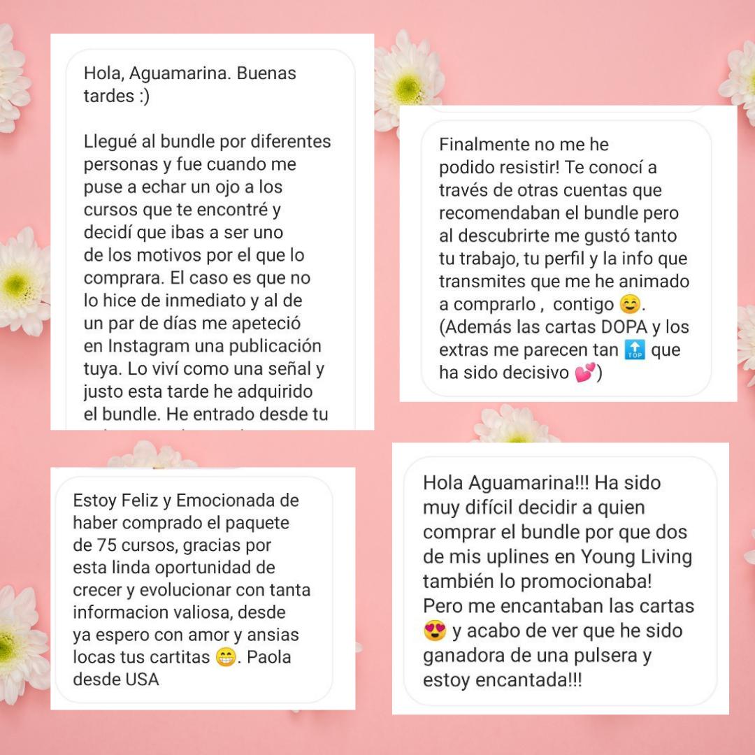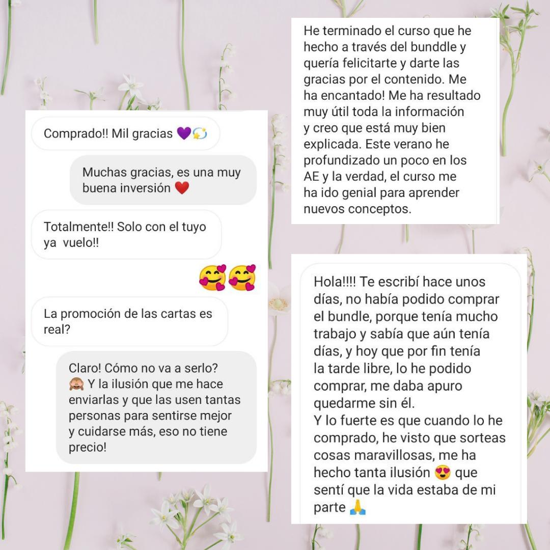 Como te decía, en el Bundle puedes encontrar mi curso de Bienestar y Autocuidado con Aromaterapia y si decides hacerte con él, desde mi enlace de afiliada, en agradecimiento a tu apoyo y confianza, te quiero hacer un pack de regalos muy especial.Mis CARTAS DOPA (con envío internacional)