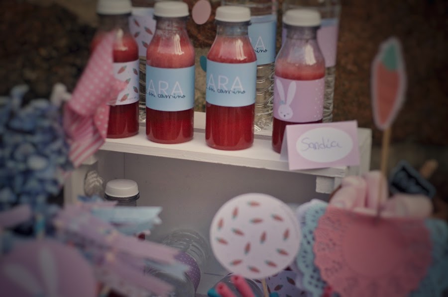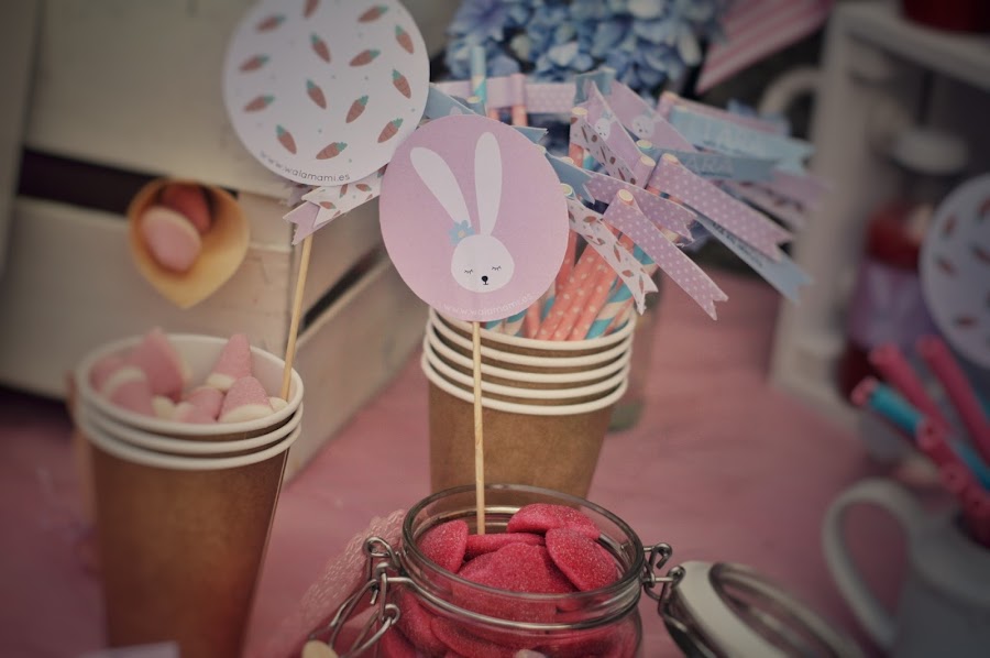 Pues a la hora de preparar todo, lo primero que hicimos fue decantarnos por un motivo y escoger los colores predominantes. El motivo lo tuvimos claro casi desde el principio porque consciente o inconscientemente mi sobrina tenía casi todo para la pequeña de conejitos, era claro nuestro personaje, y con respecto al color, una mezcla de tonos azul, verde y sobretodo rosa sería perfecto.