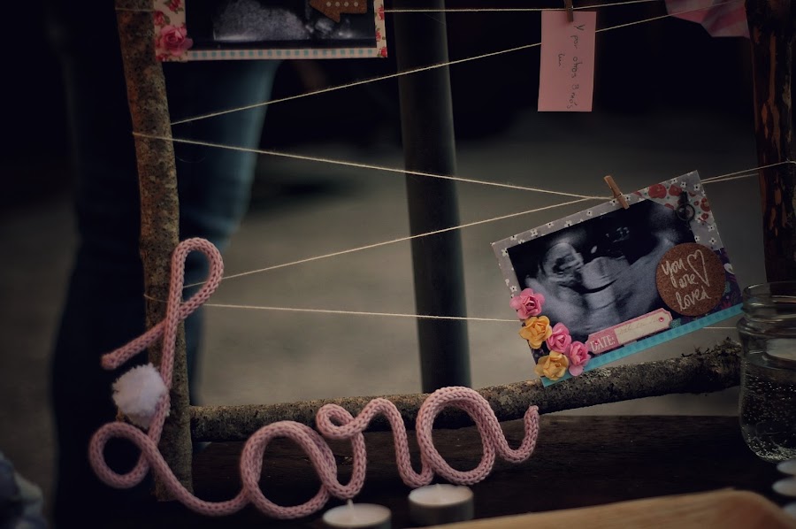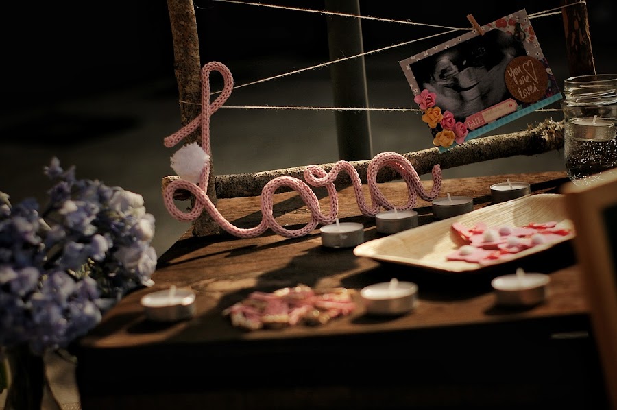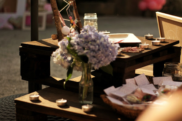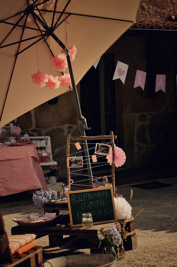 Luego quisimos hacer una zona relajada para sentarnos, conversar y dejar una dedicatoria a la futura bebé y fue así como hicimos este rincón con muebles de palets, el precioso nombre en rosa es de @walamami y el marco para colgar las dedicatorias lo hicimos con ramas y cuerda, cartulinas en los mismos colores y algunas ecografías decoradas, una pizarra pidiendo a los invitados su firma, un cubo con agua, flores y muchas velas para hacer este rincón más acogedor. Aquí también colocamos los recuerdos y los broches de conejitas que se colocaban los invitados al llegar.