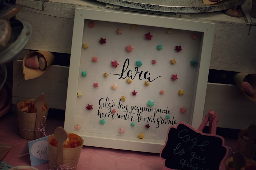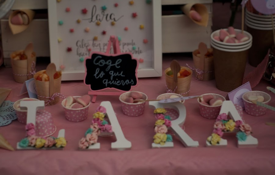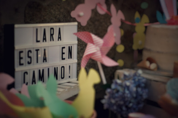 Decidimos separar los ambientes de una forma clara porque teníamos mucho espacio al aire libre. Lo primero sería el Candy Bar o mesa dulce, "Lara está en camino" fue nuestra frase para todo y estaba presente en la mesa también.