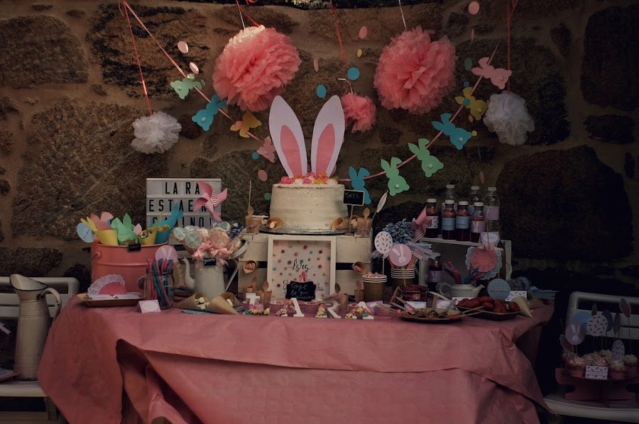 Manteles de papel en color rosa, pompones de papel en rosa y blanco y una guirnalda que hice con la forma de conejitos que predominó por toda la decoración y una preciosa y enorme tarta con orejas de conejito.