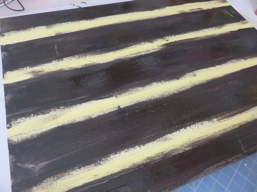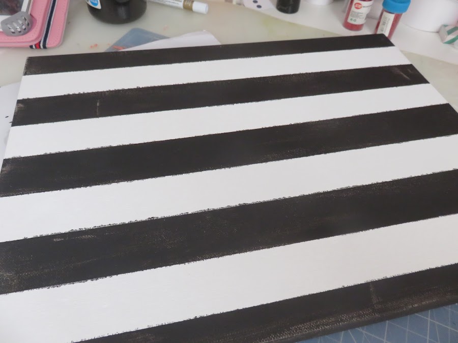 - Acto seguido pinte de negro las rayas, como veís en la foto final seran negras y blancas ( no las pinto, se quedará en la textura propia del lienzo). Le di dos manos de pintura, para acelerar el proceso de secado le aplique calor con un secador. Todo fue muy rápido.