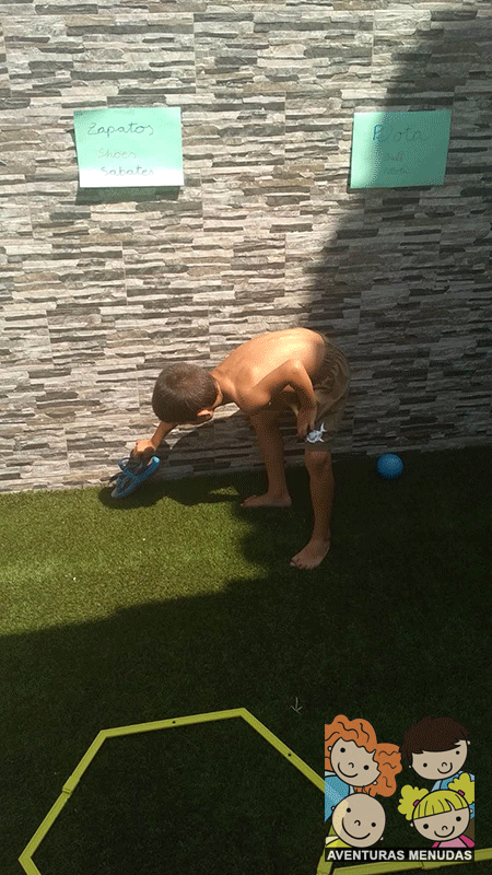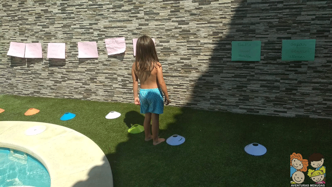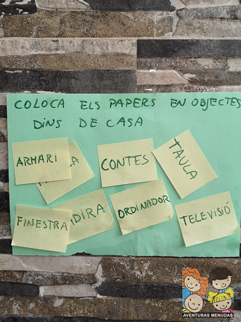 La idea es que el niño primero lea las palabras que pone en el cartel, con lo que debéis usar un tipo de letra que sepa leer y adecuado a la edad del niño. Desde luego, si la actividad es para niños más pequeños que no saben leer aún, podemos usar fotos de los objetos o dibujos, acompañados de la palabra para que se familiaricen con el texto también.