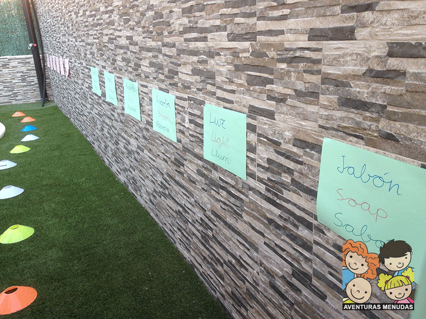 El material que hemos preparado es muy sencillo de hacer. Son folios con palabras en varios idiomas. Es posible hacerlo así al principio y luego poner la palabra en un solo idioma. Nosotros queríamos que trabajaran el vocabulario castellano, valenciano e inglés, así que pusimos palabras de objetos que pueden encontrar en casa en esos tres idiomas.