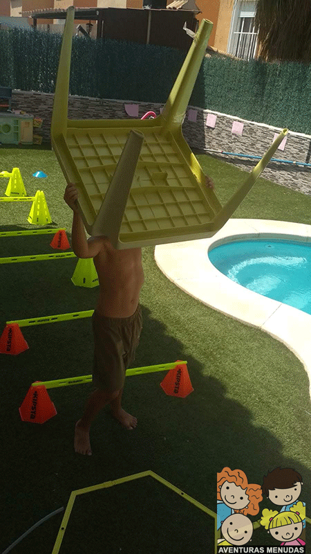 En nuestro caso, porque hacemos circuitos en las clases que imparto, tenemos material que aprovechamos en casa también. Así que cada día un circuito diferente, aprovechando toboganes, pelotas y porterías, balones y canastas y todo tipo de elementos.