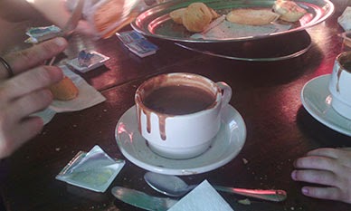 Les descubrimos a nuestros amigos el secreto de la playa de Laga, comer chocolate con tostadas. Es típico del bar que está en la misma playa, comer se un "chocolate completo", que así hay que pedirlo con un vasito de agua, mientras por los cristales ves la mar y las evoluciones de los surfistas.