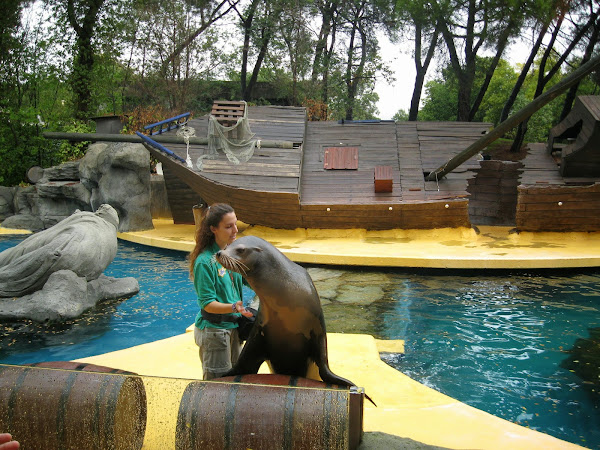 Nos comunicaron nada más entrar que el espectáculo de los delfines de las 12 estaba suspendido por causas técnicas, supongo que fue por la tromba de agua que cayó el día anterior. Pero que el de los leones marinos estaba a punto de empezar. "Por ese camino de la derecha, por donde va ese coche, ahí mismo está". Seguimos al coche de golf y efectivamente ahí mismo estaba, justo a tiempo.