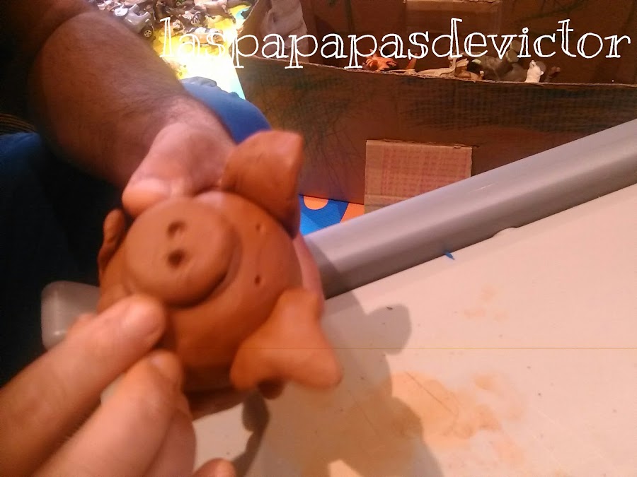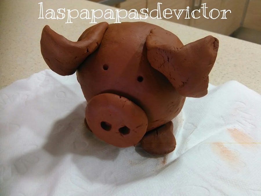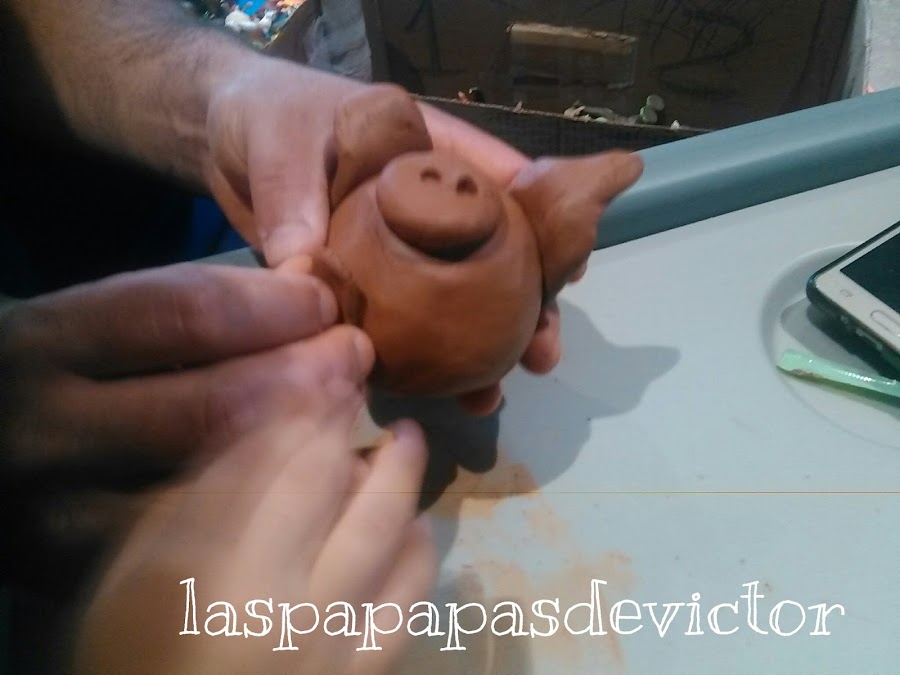Hacer una bolita grande y otra más pequeña y aplastar un poco la pequeña y hacerle dos agujeros que será el hocico