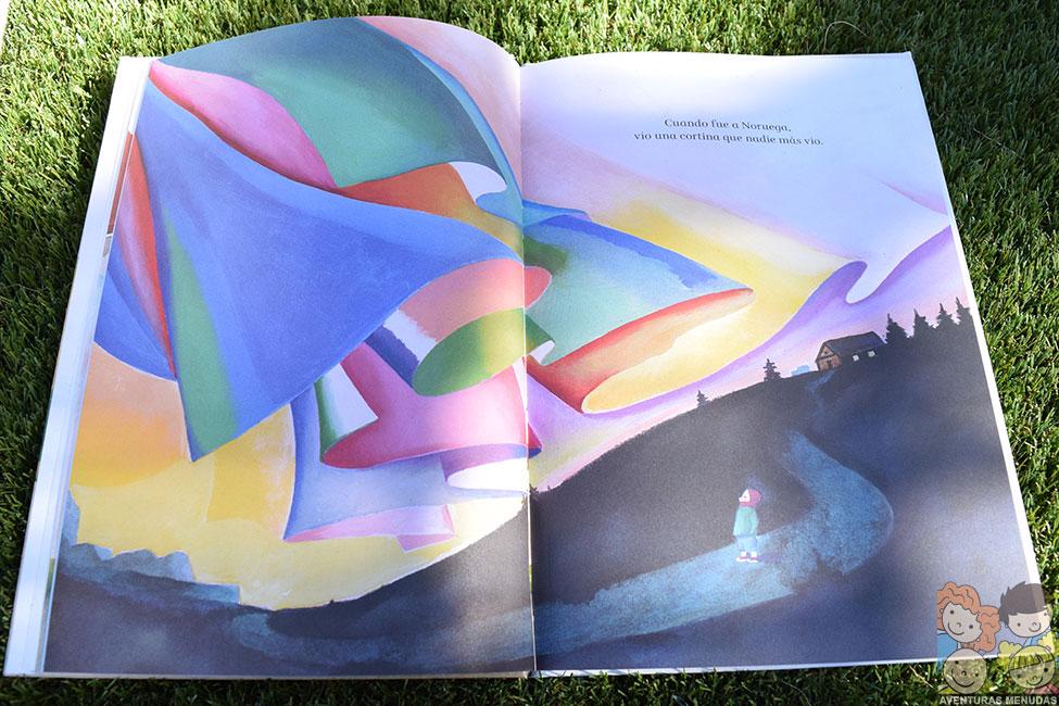 Como podéis ver en las imágenes, las ilustraciones son muy artísticas, con mucha personalidad, mucho colorido y mucho detalle. Son muy especiales, ya a los peques les suscita mucho la curiosidad, e investigan en cada una de sus hojas para buscar los elementos que cuenta el protagonista, o incluso descubrir otros peculiares por ellos mismos.