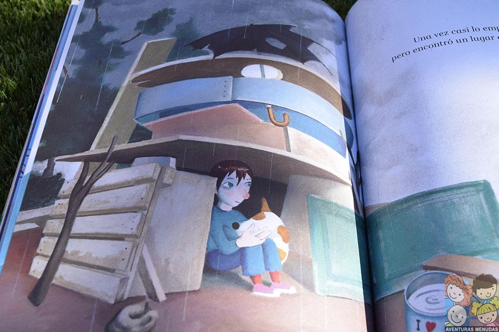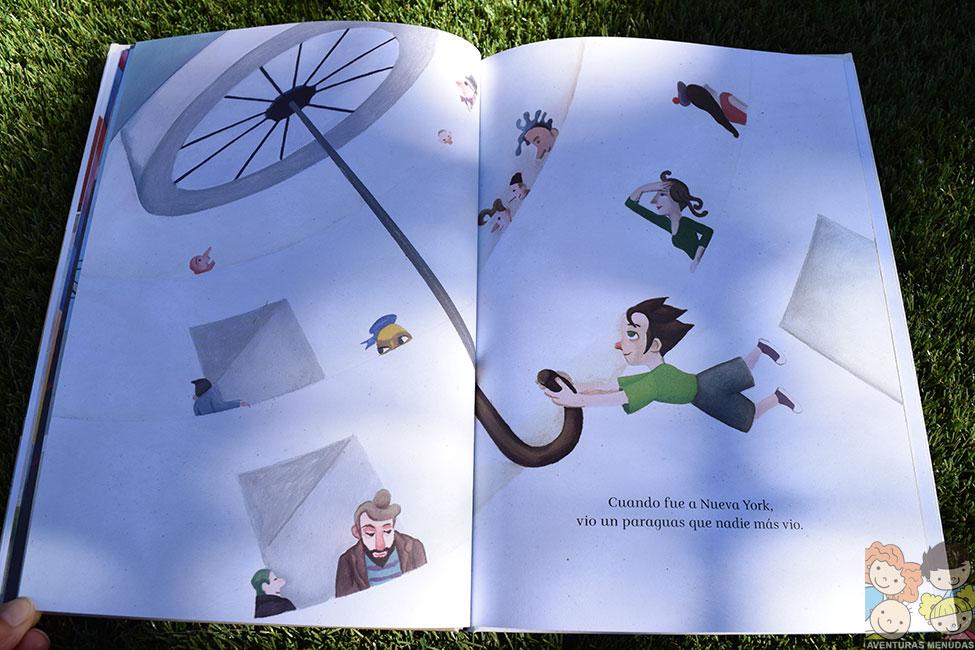 O en otra ocasión se puso a llover y casi se empapó pero encontró un lugar donde refugiarse, en el que había un paraguas que le ayudó a que no se mojara… ¡cómo el que había visto en Nueva York!.