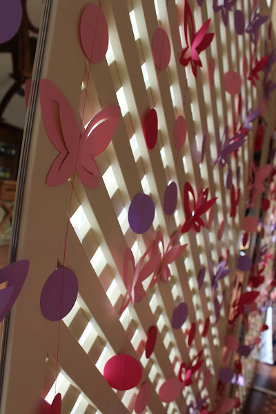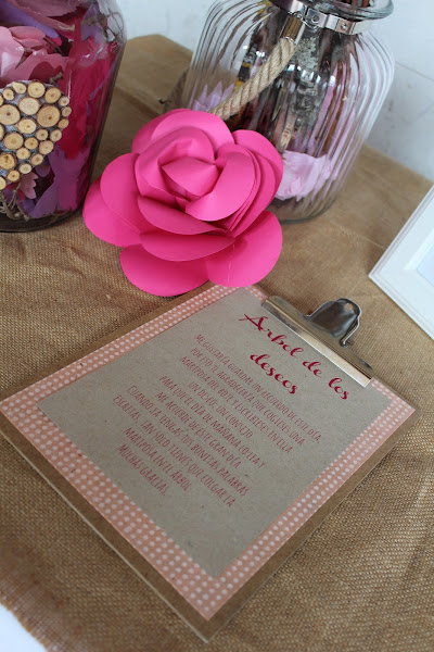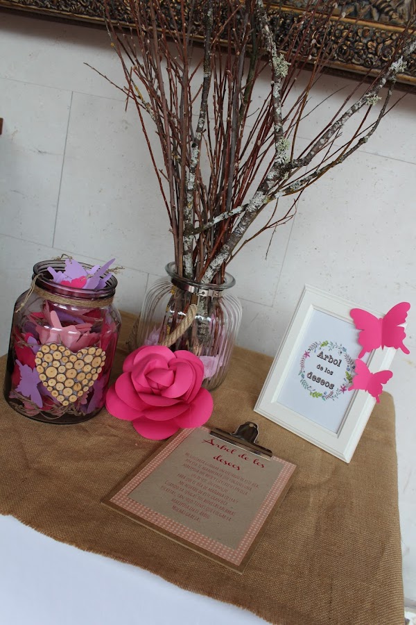 Esta vez queríamos dar un toque original a la mesa de firmas y por ello elegimos el "Árbol de los deseos¨. Se trataba de poner una dedicatoria, deseo o consejo para Claudia en unas mariposas que habíamos preparado en un bote de cristal y luego colgarlas de las ramas del árbol que habíamos preparado.
