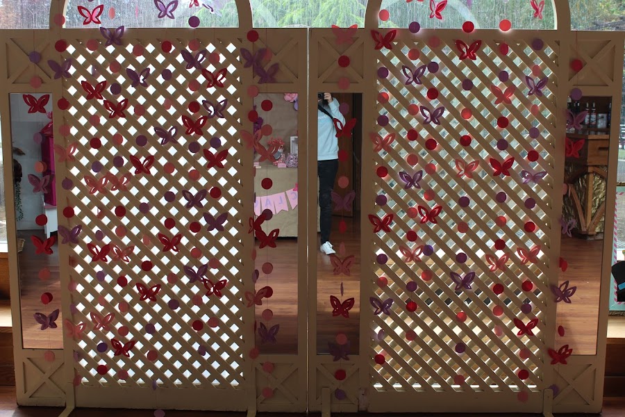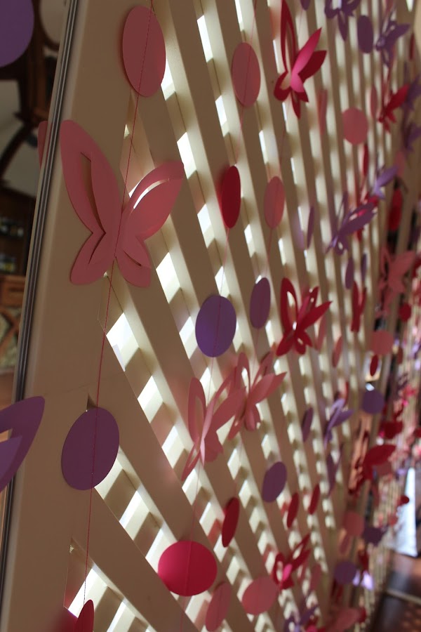 Esta vez para empezar a trabajar contábamos con los colores , rosa y morado. Otra cosa que nos ayudó mucho a la hora de elegir la decoración, fue saber que a Claudia la gustaban mucho las mariposas. Con esos datos nos pusimos manos a la obra y pronto tuvimos claro cómo iba a ser el photocall. Cosimos a máquina y una a una las tiras que luego pondríamos como fondo. Unas tiras que combinaban los colores elegidos para la decoración y las mariposas que tanto le gustan a Claudia. Esto unido a unos accesorios y marcos que elegimos para la ocasión hicieron que las fotos quedarán realmente divertidas!!!!