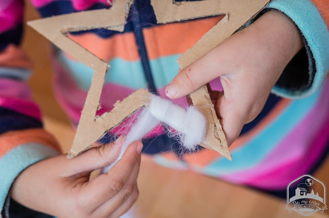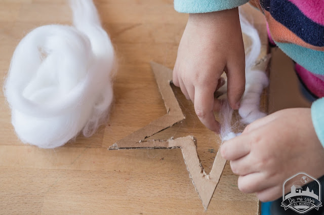Enrollamos poco a poco tiras de un centímetro de grosor aprox. de lana cardada blancaalrededor de la estrella, fijándonos en que las tiras queden planas y teniendo especial cuidado con las esquinas.