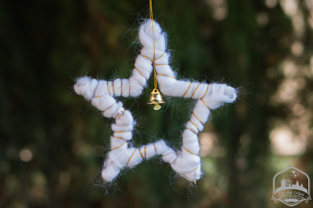 Finalmente colgamos la campanita en medio de la estrella con un poco más de cordón dorado, y utilizamos el mismo trozo para crear un lazo y poder colgarla en el árbol, o en el belén si nos gusta más.