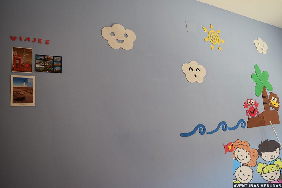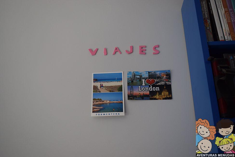 En un espacio en la pared de cada uno, cortamos la letras que forman la palabra VIAJES en goma eva del color preferido de cada uno y lo pusimos en la pared con white tack, una especie de chicle blanco que permite pegar en las paredes cosas de poco peso y que luego se quita con facilidad.