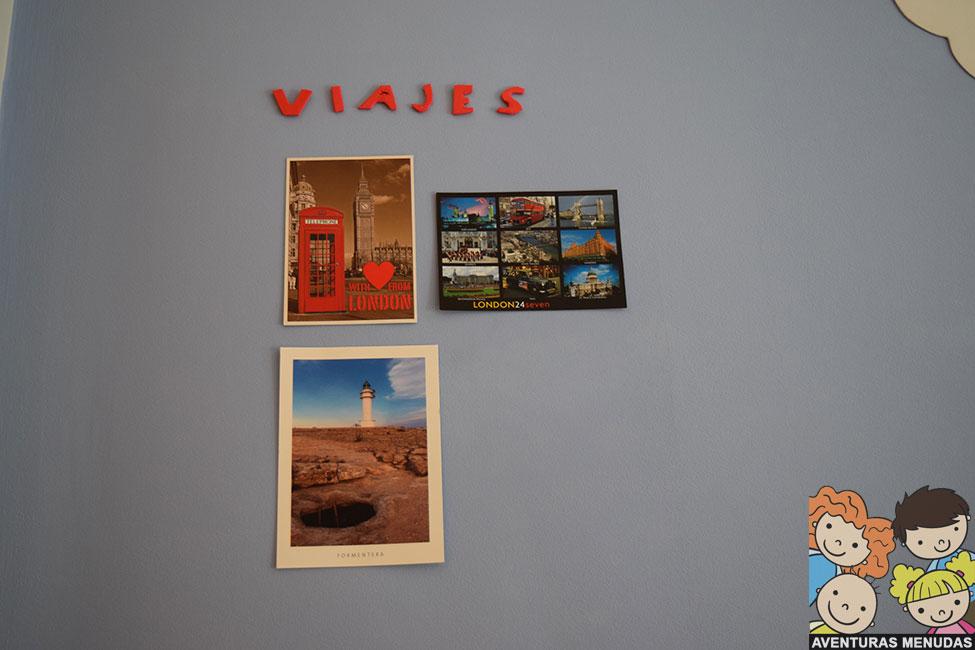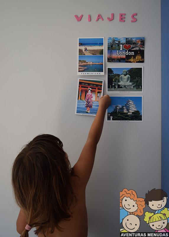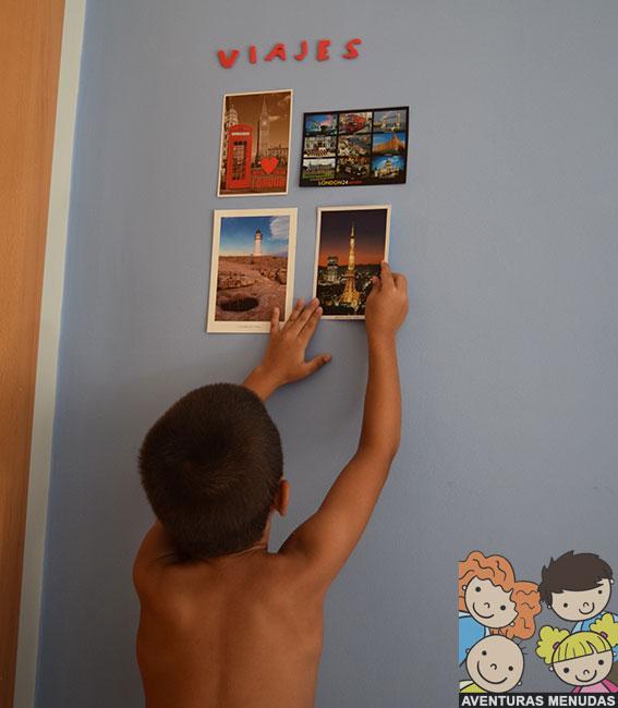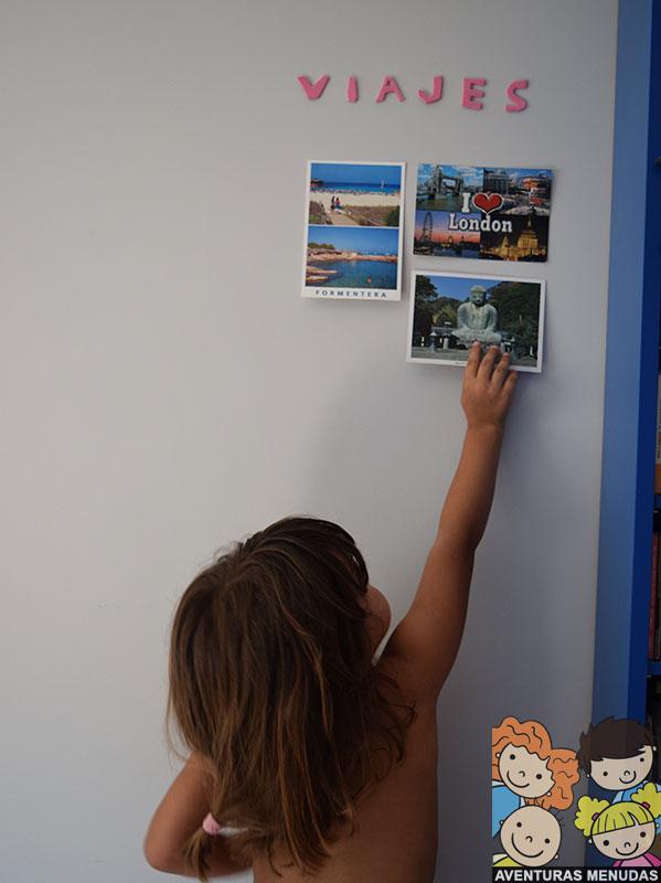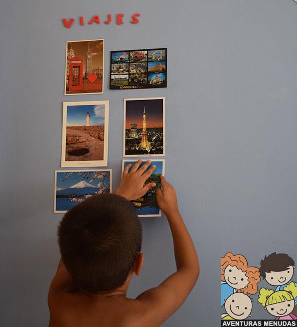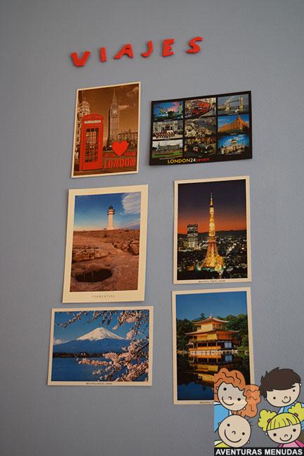 Después hemos comenzado a colgar debajo las postales que adquirimos en cada lugar que visitamos.